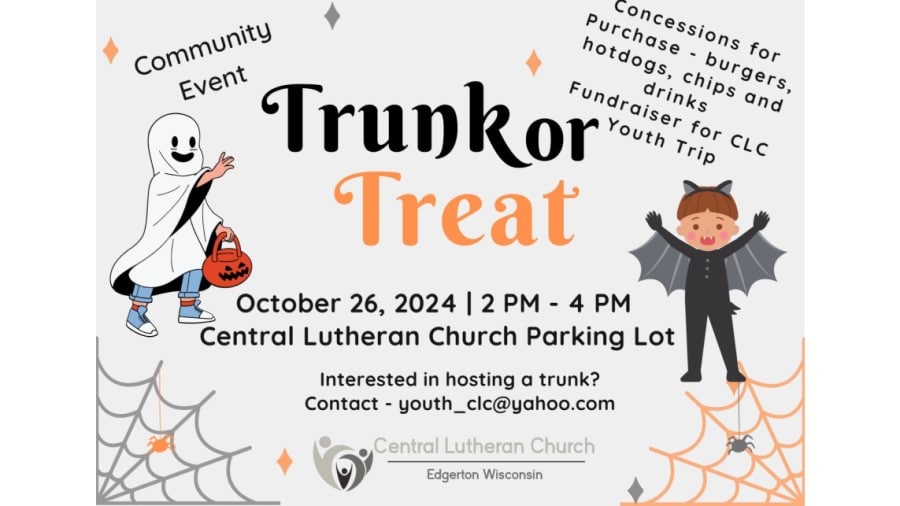 Central Lutheran Church 100 W Rollin St, Edgerton, WI, United StatesDress up in your best costumes and enjoy this community-wide Trunk-or-Treat event. Concessions are available for purchase. Prizes will be awarded to the top 3 best-decorated trunks. Proceeds benefit CLC's Youth Mission Trip.